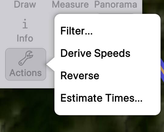 - Presents a form where you can enter your average speed and other information, from which estimated times along the track or route will be calculated, replacing any existing time information. Read More about Estimate Times.