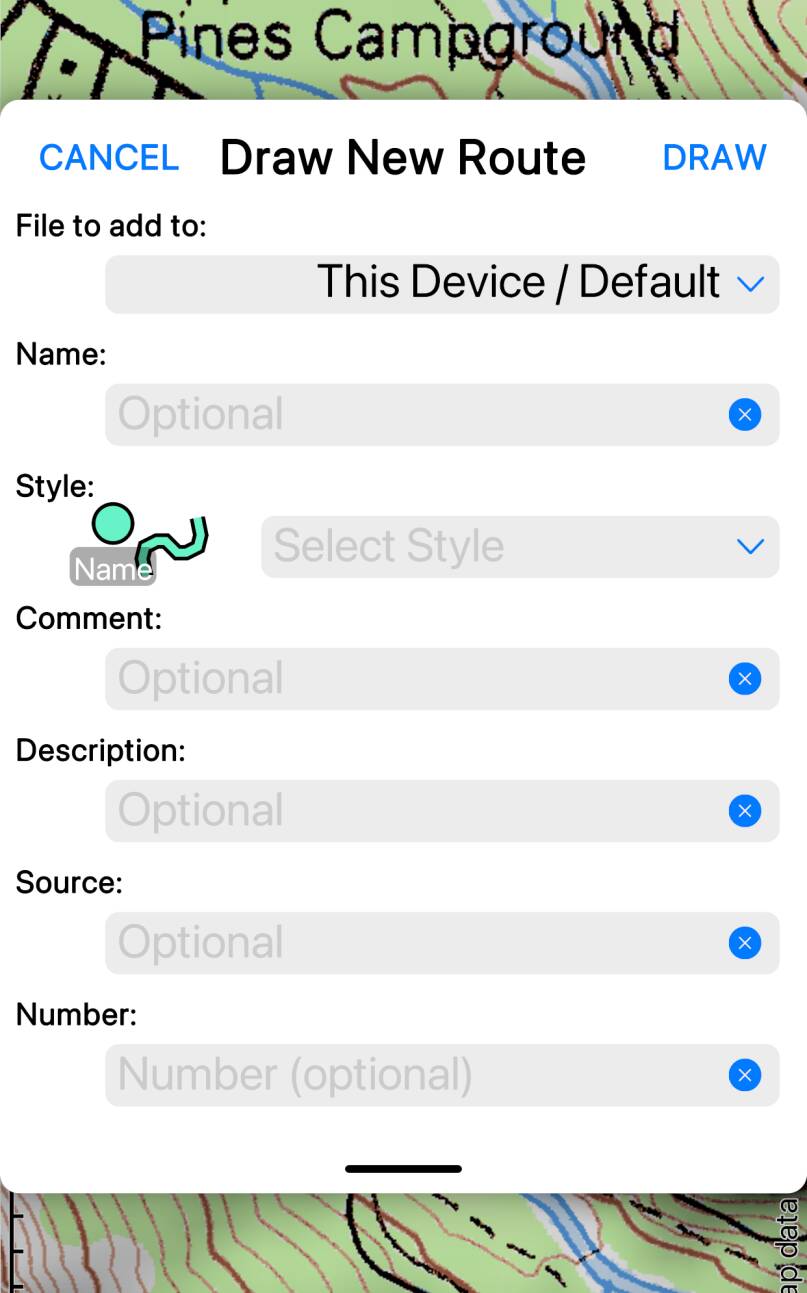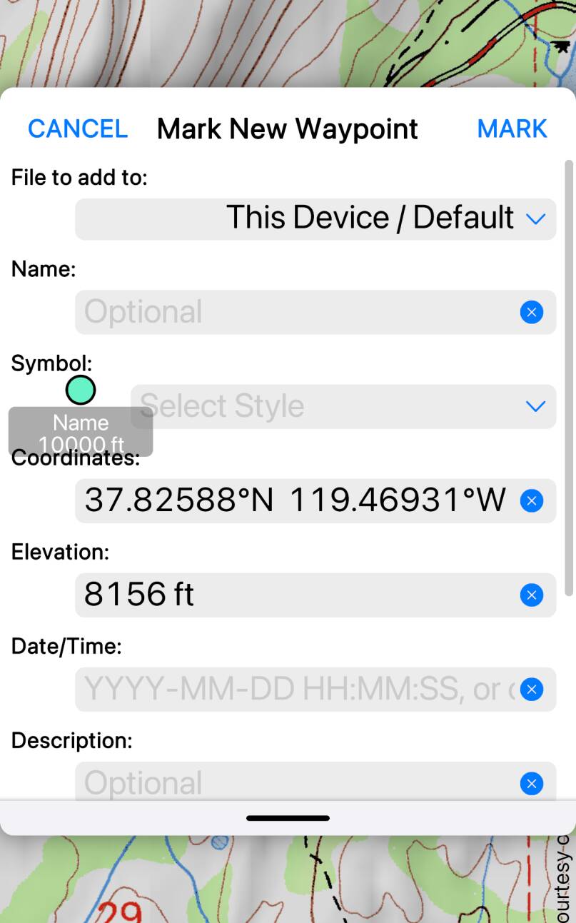 - Tap to add a point with a name or symbol. Most of the track’s points are anonymous, but you can use this button to show a form where you can set a name, symbol or other attributes for this point. Use this to mark points of interest along your track.