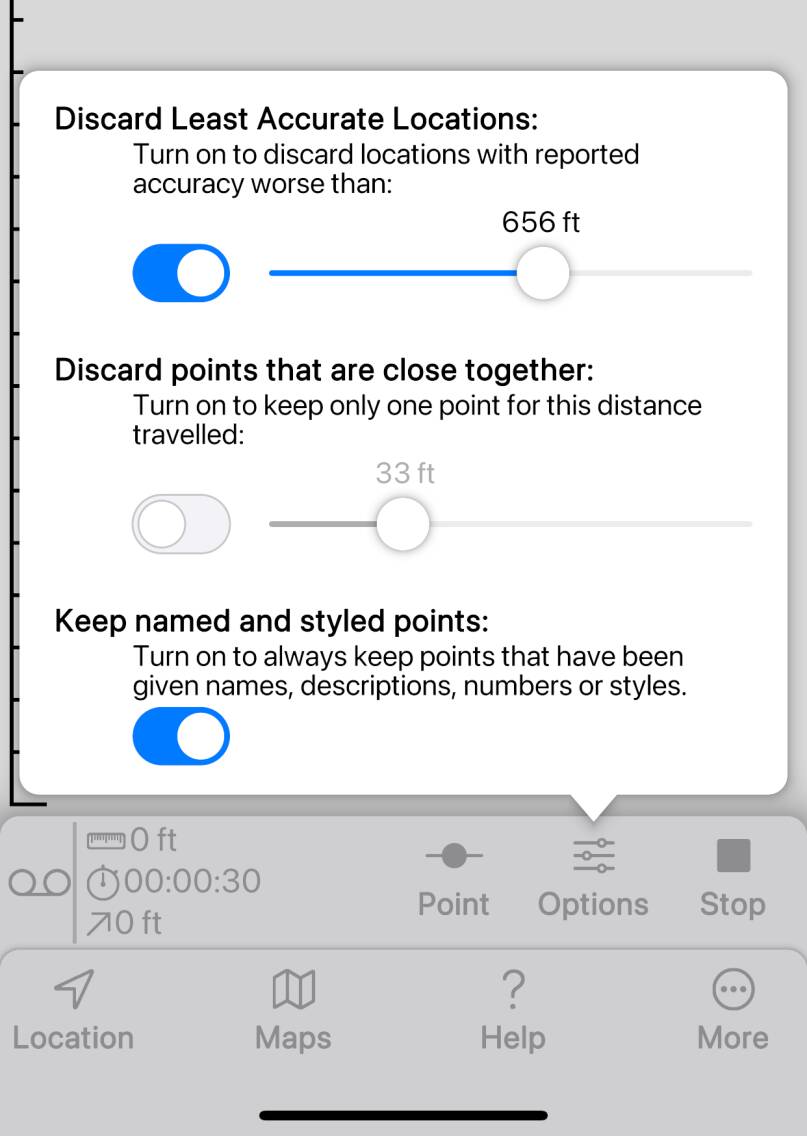- Discard points with no elevation: (Not shown in the screenshots). Turn this on and points that don’t include an elevation value will be filtered out. Generally, accurate points from the GPS will include elevation; less accurate points from other location sources will not. Turning this on will improve graphs of elevation.