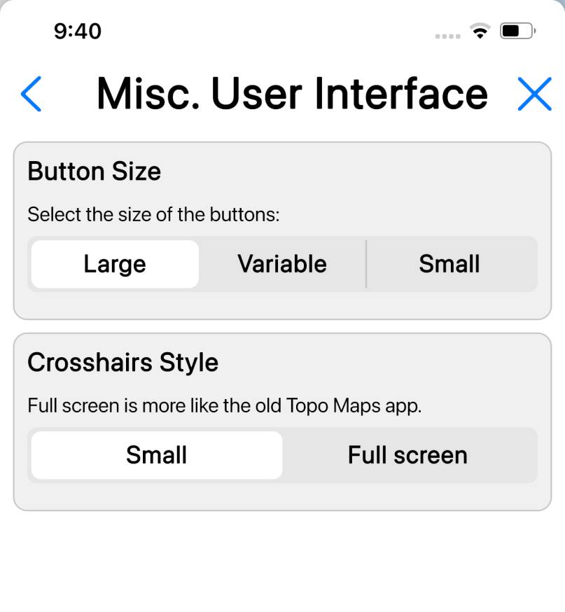 a full-screen, thin, gray cross. (The latter matches the style in the old Topo Maps app.)